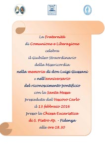 La Fraternità di Comunione e Liberazione celebra il Giubileo Straordinario della Misericordia nella memoria di don Luigi Giussani e nell’anniversario del riconoscimento pontificio con la Santa Messa presieduta dal Vescovo Carlo il 13 febbraio 2016 presso la Chiesa Eucaristica di S. Pietro Ap. – Fidenza alle ore 18.30