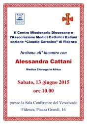 Il Centro Missionario Diocesano e l’Associazione Medici Cattolici Italiani sezione “Claudio Carosino” di Fidenza invitano all’incontro con Alessandra Cattani