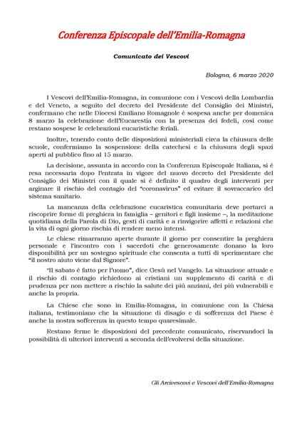 Conferenza Episcopale dell’Emilia-Romagna Comunicato dei Vescovi Bologna, 6 marzo 2020 I Vescovi dell’Emilia-Romagna, in comunione con i Vescovi della Lombardia e del Veneto, a seguito del decreto del Presidente del Consiglio dei Ministri, confermano che nelle Diocesi Emiliano Romagnole è sospesa anche per domenica 8 marzo la celebrazione dell’Eucarestia con la presenza dei fedeli, così come restano sospese le celebrazioni eucaristiche feriali. Inoltre, tenendo conto delle disposizioni ministeriali circa la chiusura delle scuole, confermiamo la sospensione della catechesi e la chiusura degli spazi aperti al pubblico fino al 15 marzo. La decisione, assunta in accordo con la Conferenza Episcopale Italiana, si è resa necessaria dopo l’entrata in vigore del nuovo decreto del Presidente del Consiglio dei Ministri con il quale si è definito il quadro degli interventi per arginare il rischio del contagio del “coronavirus” ed evitare il sovraccarico del sistema sanitario. La mancanza della celebrazione eucaristica comunitaria deve portarci a riscoprire forme di preghiera in famiglia – genitori e figli insieme –, la meditazione quotidiana della Parola di Dio, gesti di carità e a rinvigorire affetti e relazioni che la vita di ogni giorno rischia di rendere meno intensi. Le chiese rimarranno aperte durante il giorno per consentire la preghiera personale e l’incontro con i sacerdoti che generosamente donano la loro disponibilità per un sostegno spirituale che consenta a tutti di sperimentare che “il nostro aiuto viene dal Signore”. “Il sabato è fatto per l’uomo”, dice Gesù nel Vangelo. La situazione attuale e il rischio di contagio richiedono ai cristiani un supplemento di carità e di prudenza per non mettere a rischio la salute dei più anziani, dei più vulnerabili e anche la propria. La Chiese che sono in Emilia-Romagna, in comunione con la Chiesa italiana, testimoniano che la situazione di disagio e di sofferenza del Paese è anche la nostra sofferenza in questo tempo quaresimale. Restano ferme le disposizioni del precedente comunicato, riservandoci la possibilità di ulteriori interventi a seconda dell’evolversi della situazione. Gli Arcivescovi e Vescovi dell’Emilia-Romagna