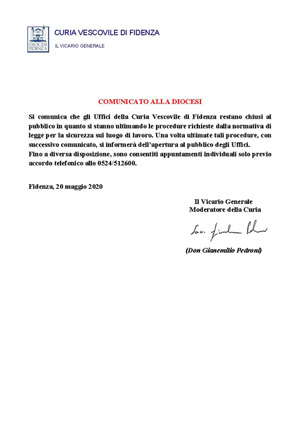 Si comunica che gli Uffici della Curia Vescovile di Fidenza restano chiusi al pubblico in quanto si stanno ultimando le procedure richieste dalla normativa di legge per la sicurezza sul luogo di lavoro. Una volta ultimate tali procedure, con successivo comunicato, si informerà dell’apertura al pubblico degli Uffici.