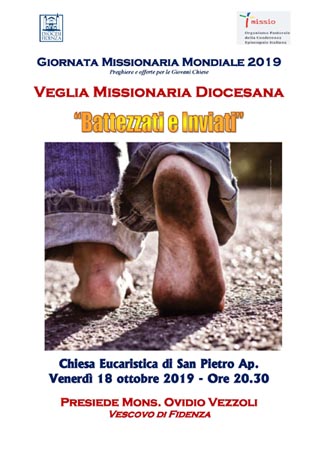 6 Settembre 2019NewsGiornata Missionaria Mondiale 2019 Giornata Missionaria Mondiale 2019 Preghiere e offerte per le Giovani Chiese VEGLIA MISSIONARIA DIOCESANA Chiesa Eucaristica di San Pietro Ap. Venerdì 18 ottobre 2019 – Ore 20.30 Presiede Mons. Ovidio Vezzoli Vescovo di Fidenza