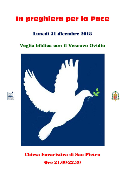 21 Dicembre 2018NewsIn preghiera per la Pace In preghiera per la Pace Lunedì 31 dicembre 2018 Veglia biblica con il Vescovo Ovidio Chiesa Eucaristica di San Pietro Ore 21.00-22.30